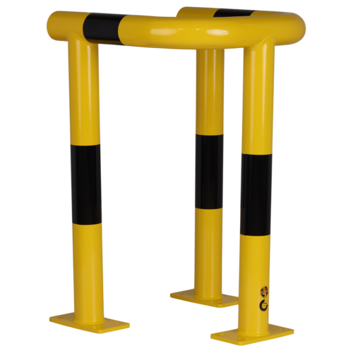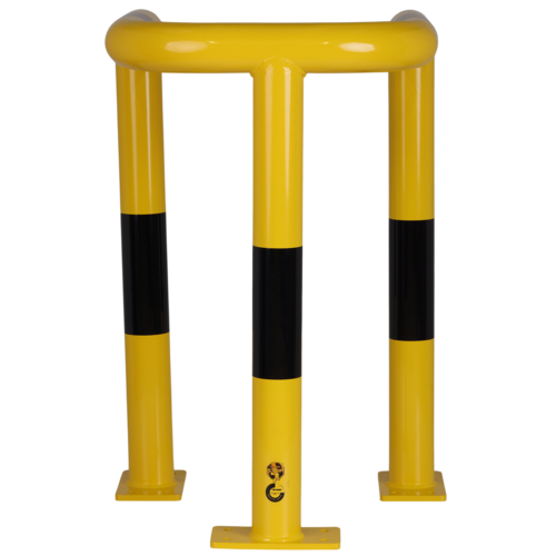 CrashStop, arceau de protection de poteau, H 800 mm, acier 3 mm, longueur de bras 520 mm, Ø 76 mm, jaune avec marquage noir, thermolaqué, platine 200x110mm.