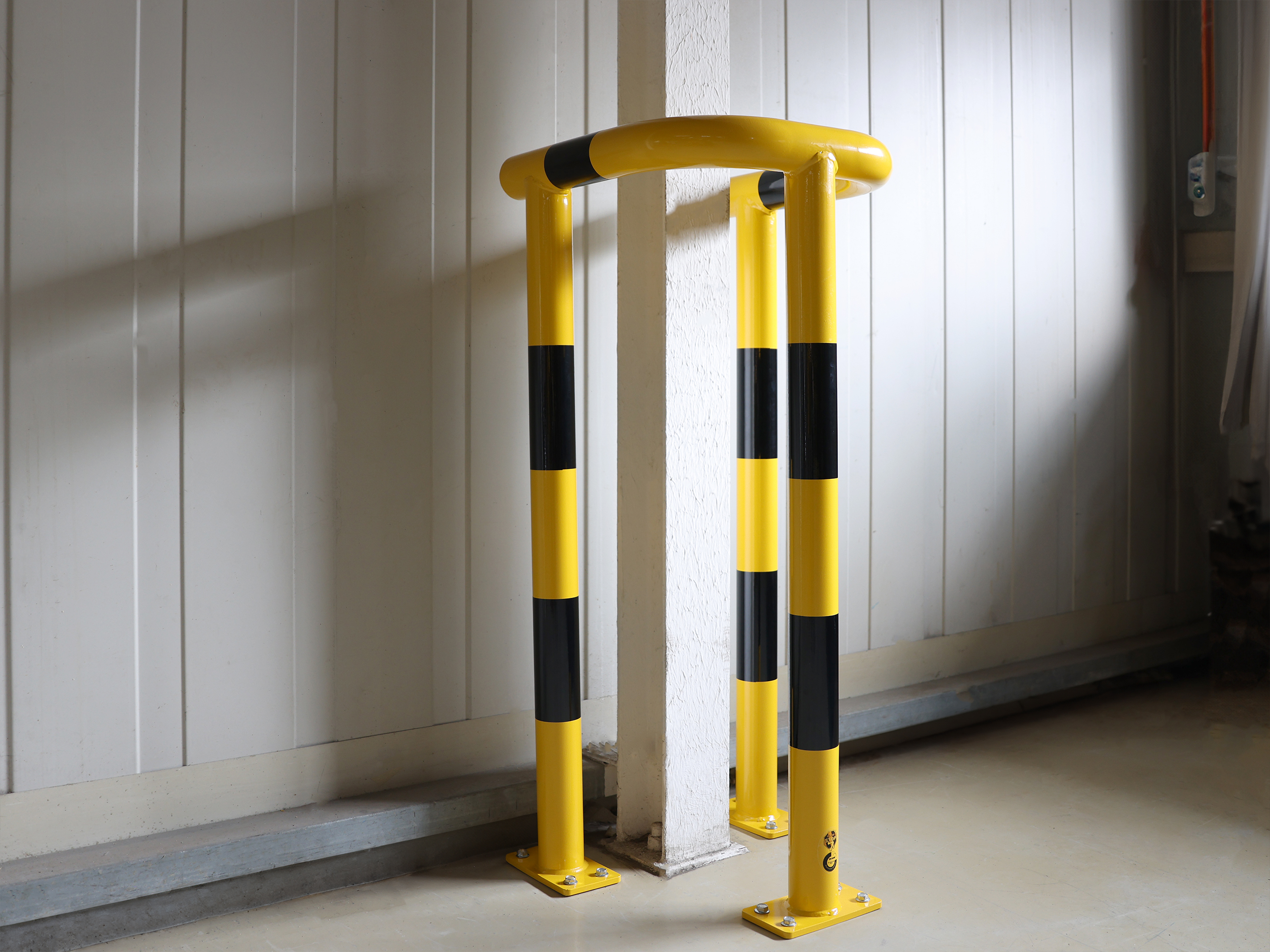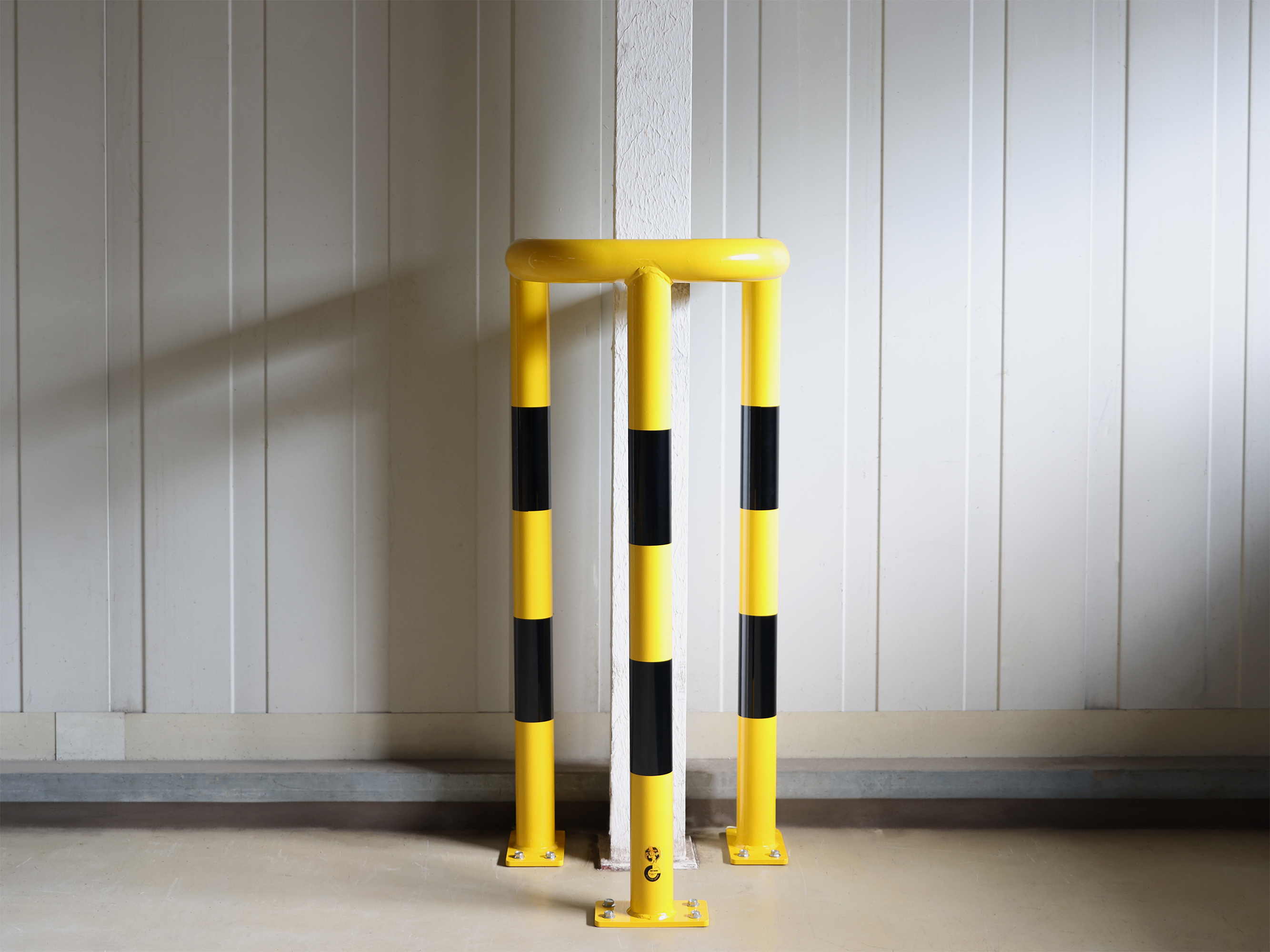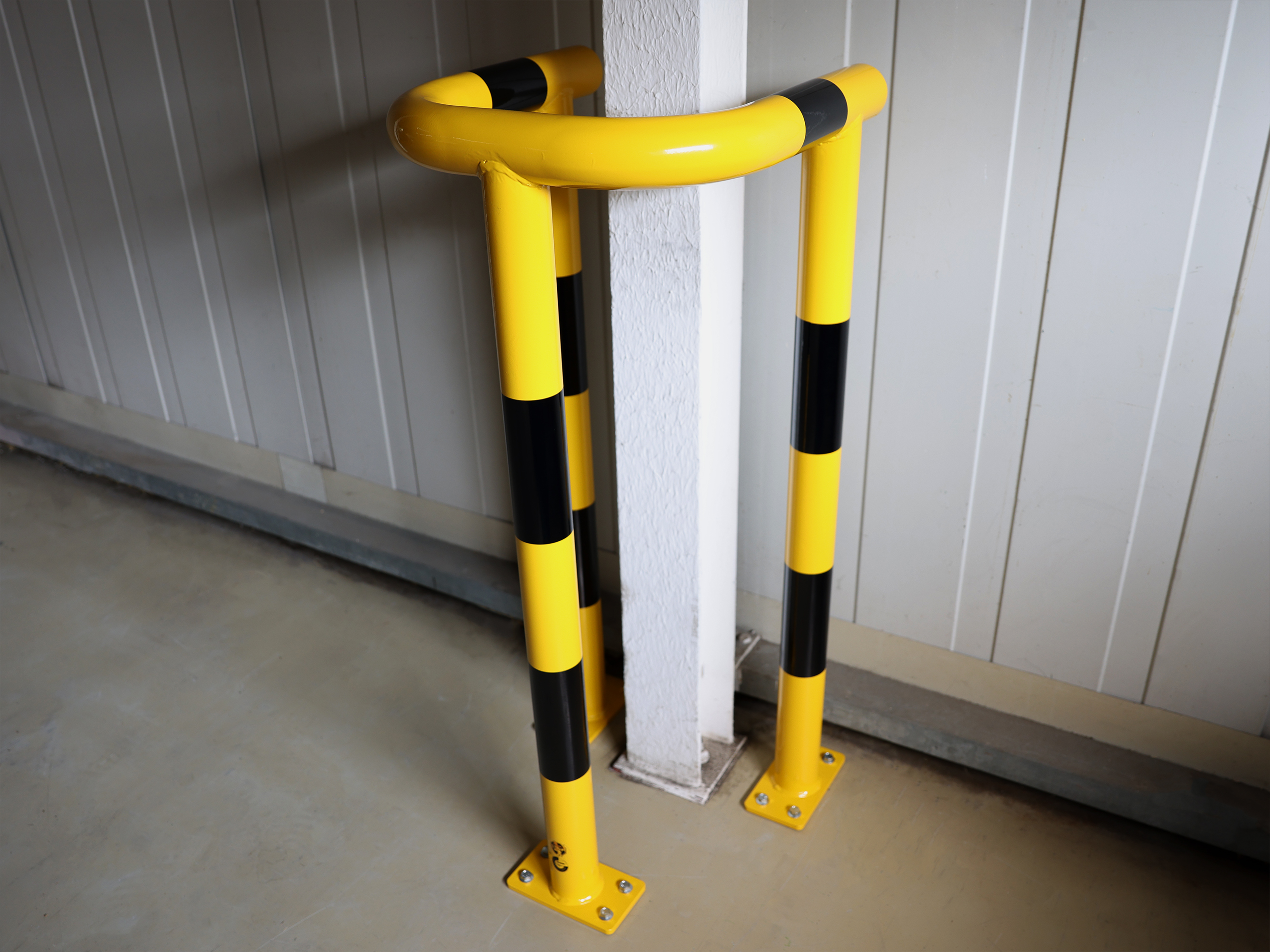 CrashStop, arceau de protection de poteau, H 1200 mm, acier 3 mm, longueur de bras 520 mm, Ø 76 mm, jaune avec marquage noir, galvanisé et thermolaqué, platine 200x110mm.